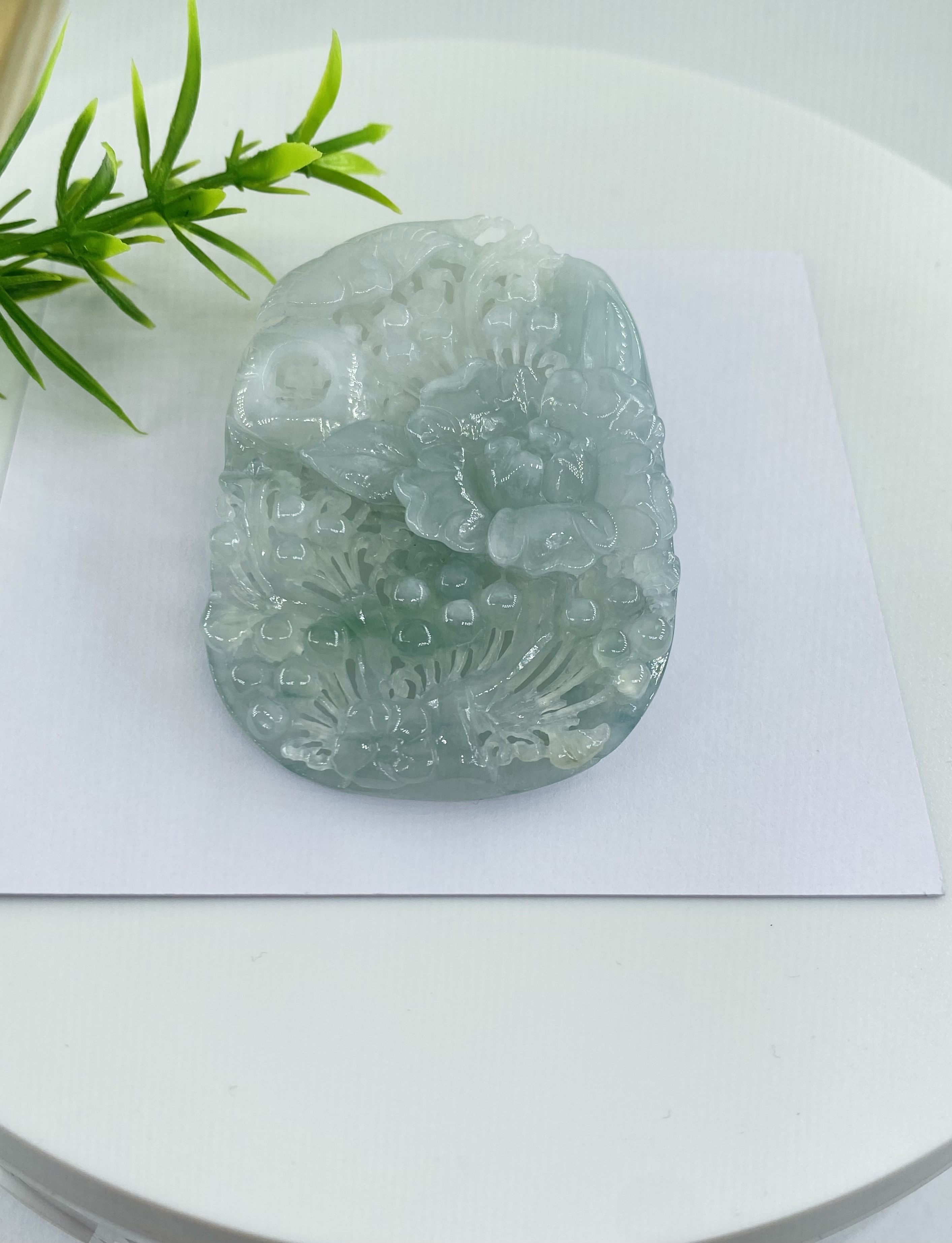 緬甸翡翠A貨 冰天空藍飄藍花膠感厚重精工鏤空花鳥牌 尺寸 57.8*41*10.5