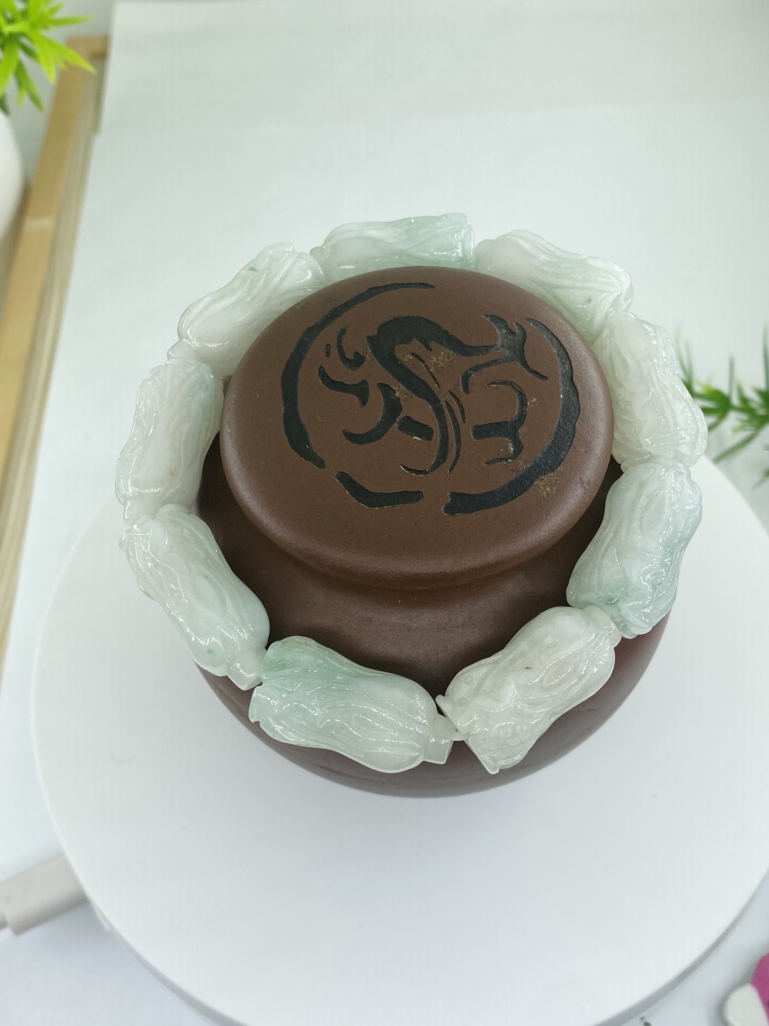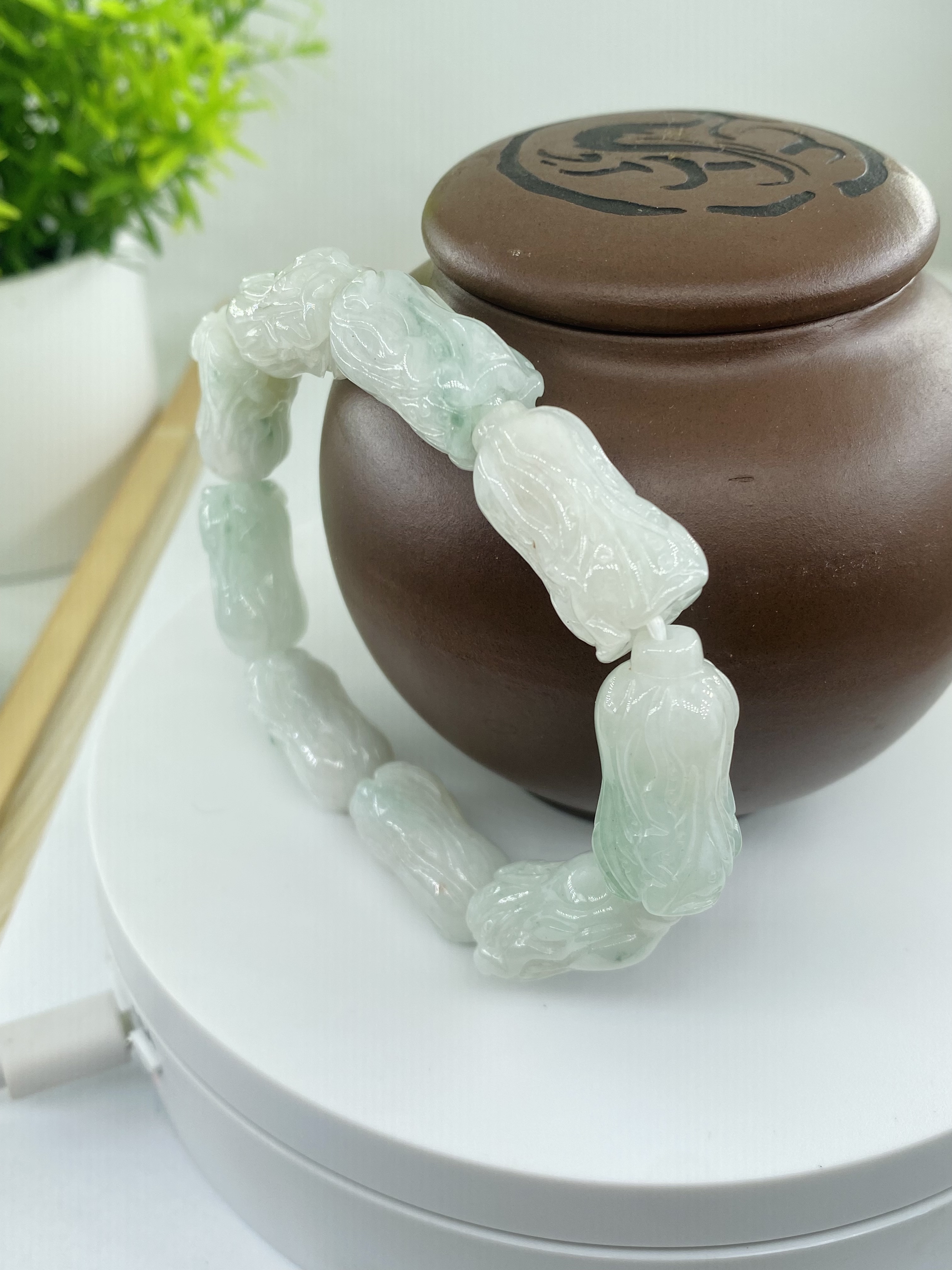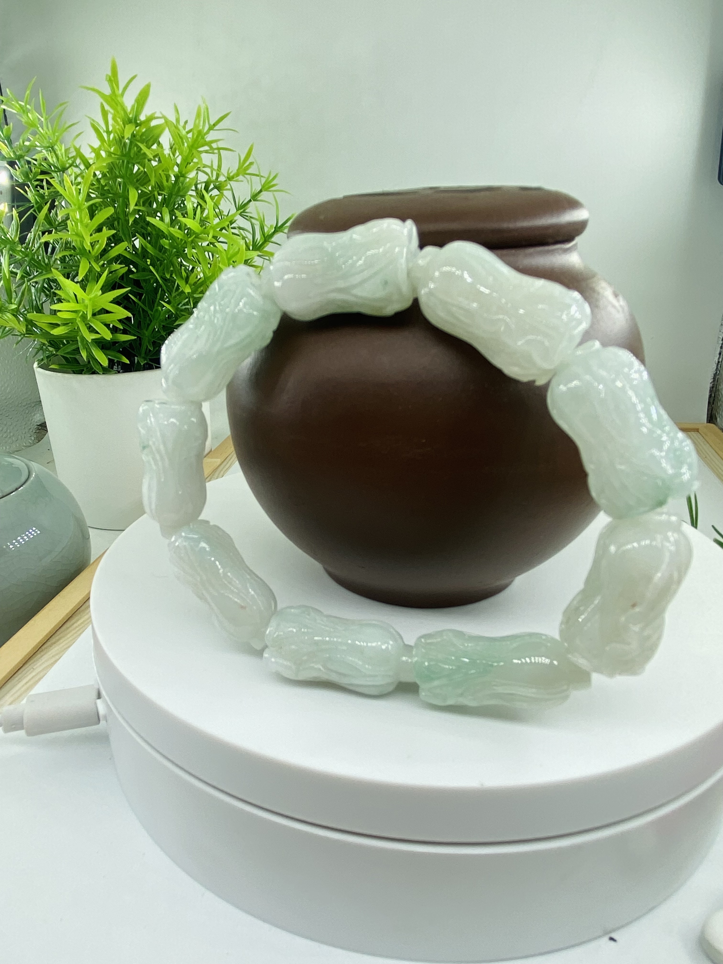 緬甸翡翠A貨 冰糯飄藍花立體白菜手串 尺寸 26*12.2*11.6mm,9粒