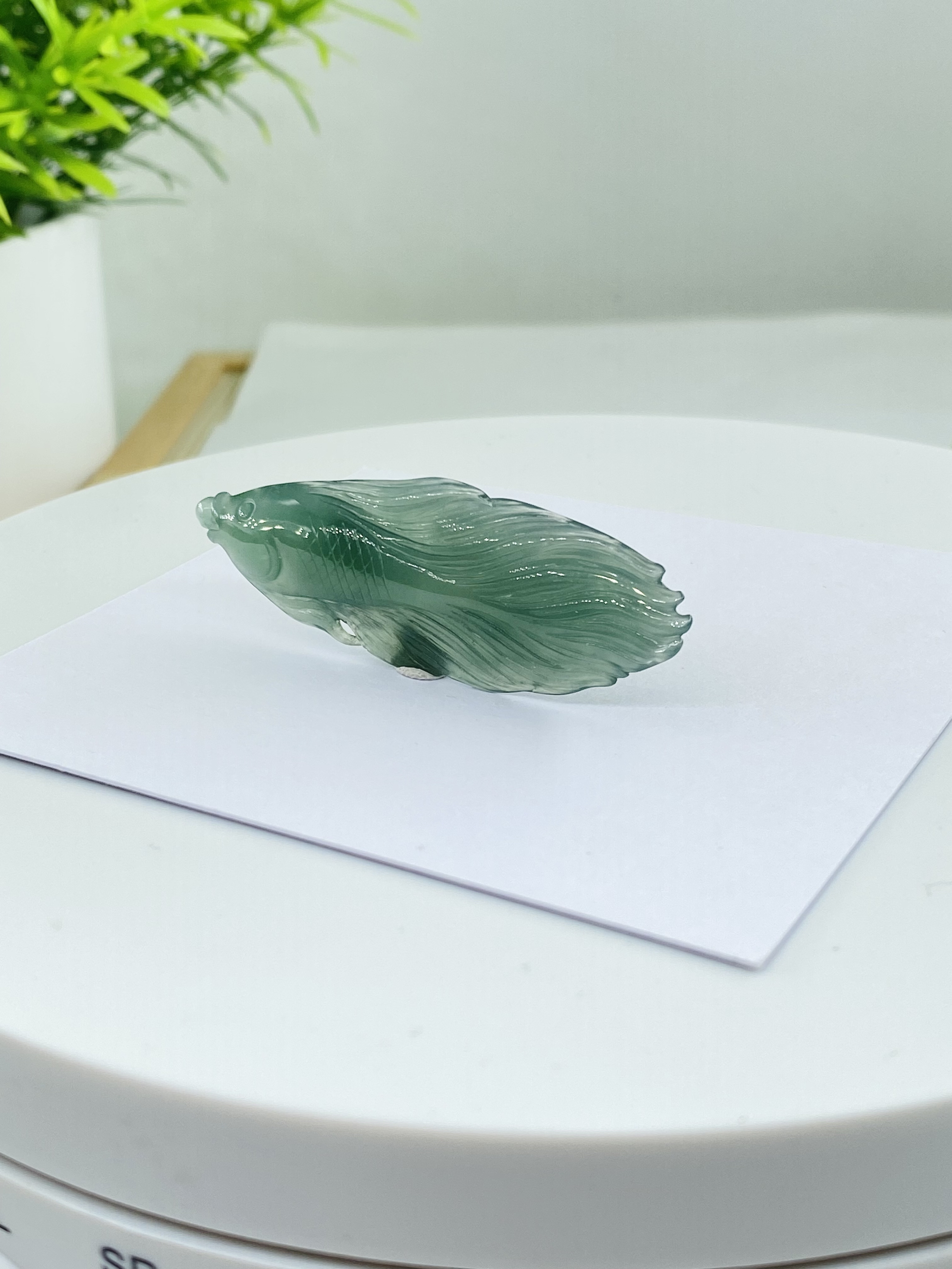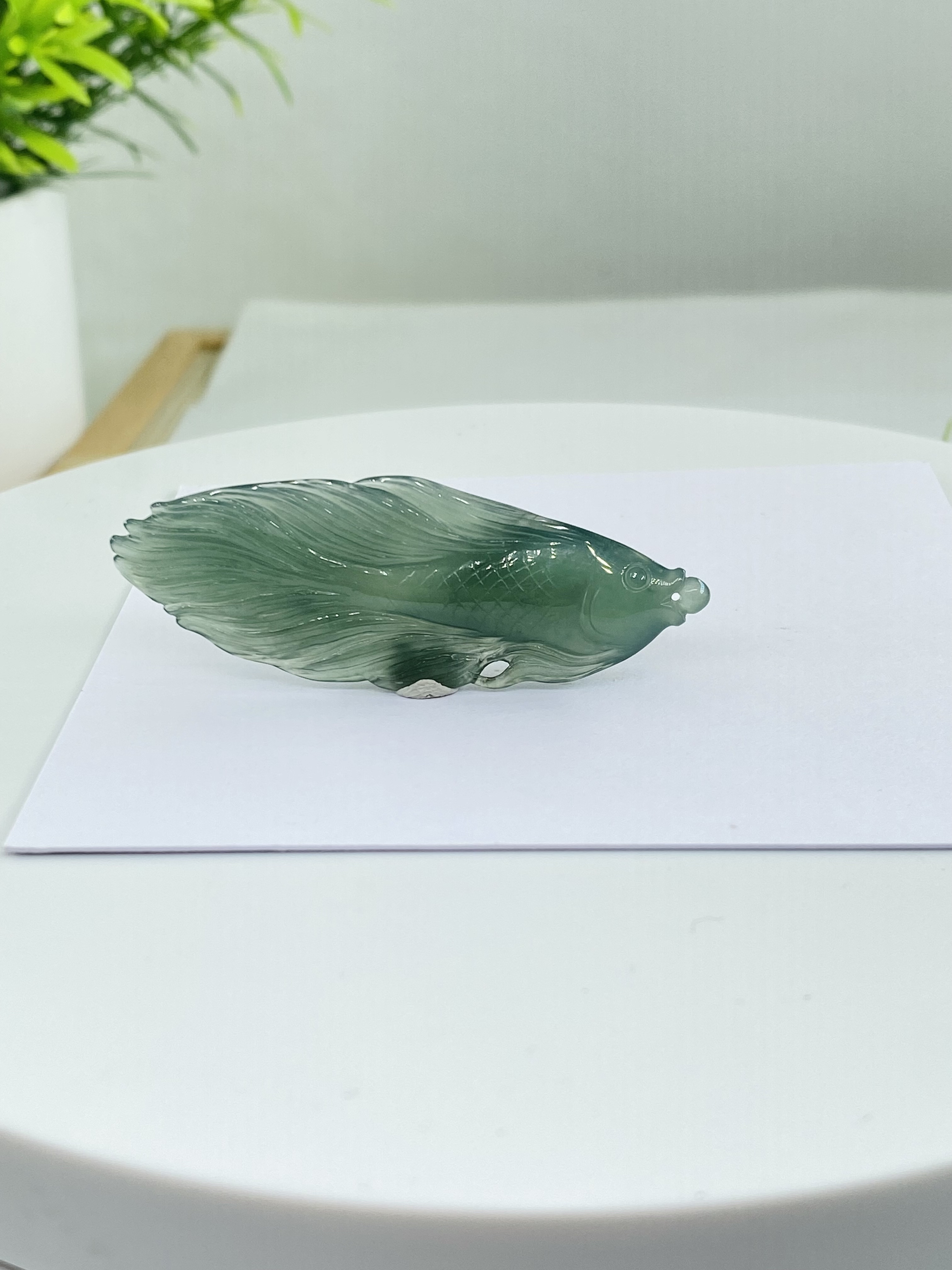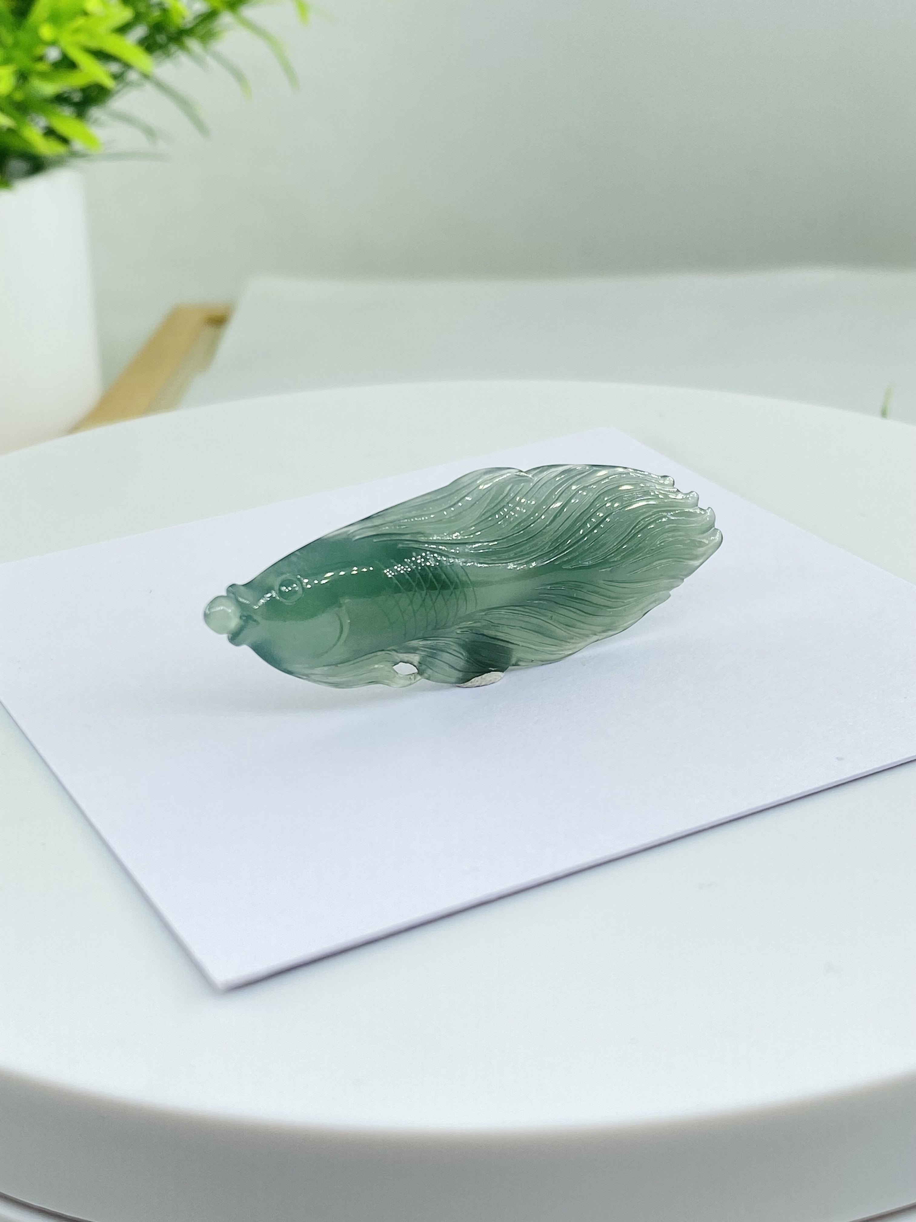 緬甸翡翠A貨 高冰老藍水精雕魚 尺寸 50.3*18.8*5.5